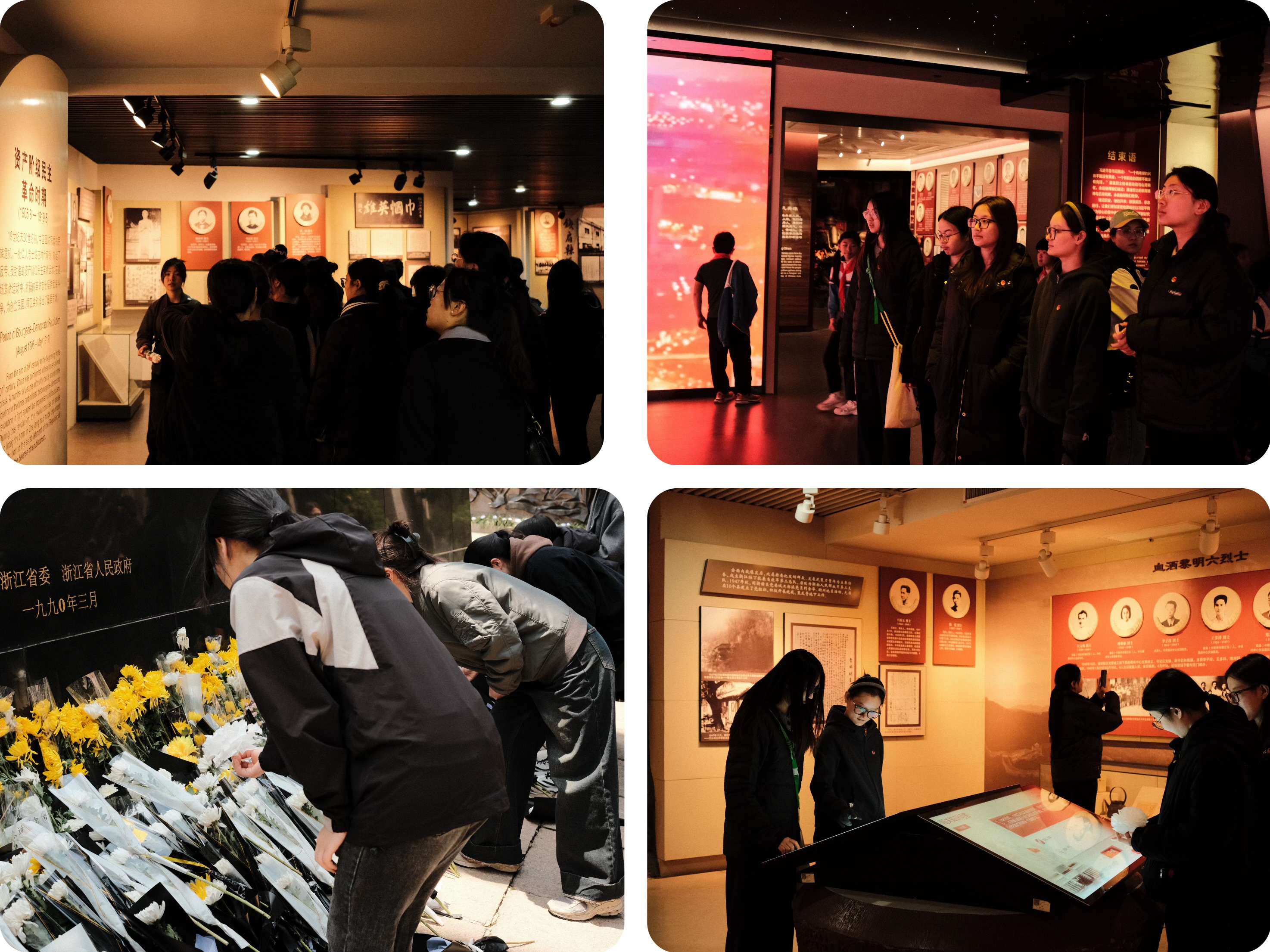 在革命烈士纪念馆内,同学们一同参观了在革命、建设和改革开放时期,为实现民族独立、国家富强、人民幸福而牺牲的浙江英雄们的事迹,馆内以丰富的照片、文物、雕塑、视频等形式再现了英雄们的光辉形象,同学们无不被先烈们不屈不挠的精神所深深打动,对“没有共产党就没有新中国”这句话有了更加深刻的理解。