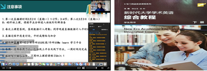 网络云课堂主要安排两部分教学内容:(1)以《新时代大学学术英语综合教程》为教材,选取教学单元,结合教学单元主题,收集整理教学素材,新建在线直播课(钉钉直播),配合搭建在线学习社区(钉钉在线教学圈),旨在帮助学生通过真实语料的学习,积累语言产出任务所需的语言内容和语篇结构,并通过在线模拟语境中的实践进行语言应用;(2)结合MOOC学习数据反馈,提炼MOOC难点,在直播课程中进行这些语言技能难点的剖析教学,旨在帮助学生切实掌握MOOC中涉及的语言技能。通过结合以上两者,最终实现传统线下实体课堂的云迁徙。