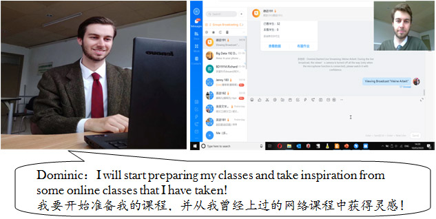 外籍教师们精心准备的一堂堂网络课程,让学生“宅”在家里也能学有所获,为学校的线上教学工作提供了很大的支持。外教也非常感谢学院的外事与教学人员对他们防控和教学的帮助,及时向他们分享防控信息,帮助他们搭建网络授课平台,协调线上教学运行安排,组织学生积极参与,及时反馈教学评价。他们认为这次抗疫的共同努力增进了他们与学校的情谊,也深化了他们对中国的理解和认识。