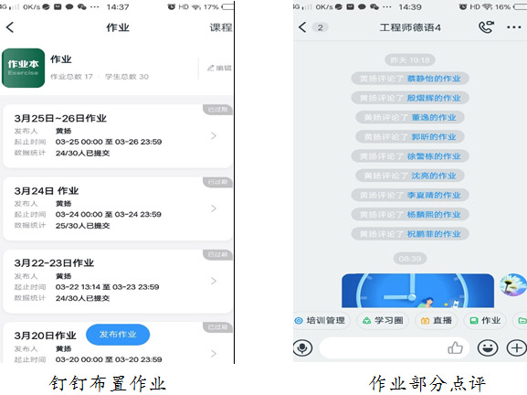 作业发布在钉钉群里,及时评价和反馈。