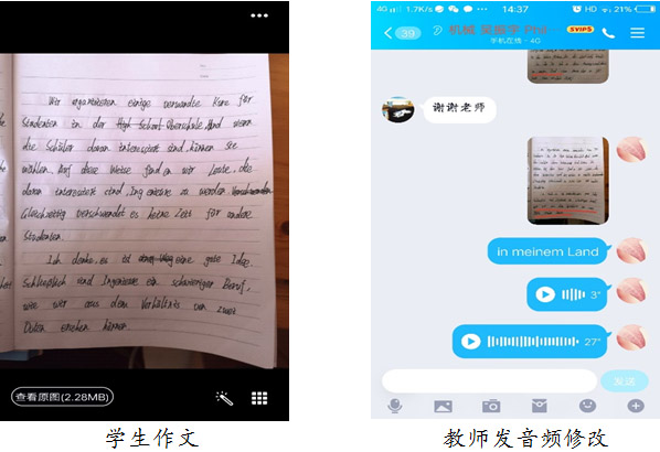 写作训练:写作耗时比较长,一般以周末作业的形式进行。学生修改后再通过QQ发给教师。教师指出问题,学生自主修改后再发给教师。对于没有批改正确的地方,教师发QQ语音和学生交流。