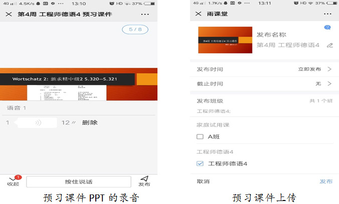 课前活动围绕雨课堂展开。每周末把下一周的预习课件PPT上传至雨课堂,教师可以给预习课件PPT录音,给学生强调注意之处。学生用自己的手机看预习课件PPT的时候可以点开收听老师发送的录音。预习课件里会提前布置下一周上课主题的词汇预习和课文预习,要求学生提前记忆和掌握。