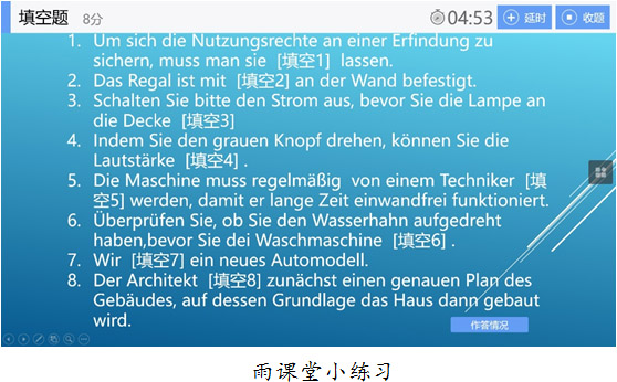 课中活动主要包括听、说、读、写的德语综合训练。受新冠疫情影响,学生本学期面临德福考试不确定性等问题,因此要求学生全面主动配合,保证课堂的学习效率。