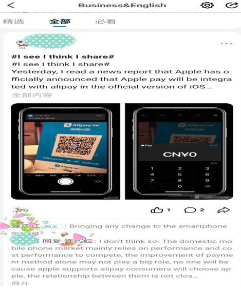 课堂内布置口语任务后,可以通过语音输入回答,要求学生在班级群内分享观点与看法,由教师抽查并点评。