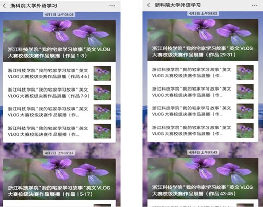 4月1日-4月5日,VLOG作品网络陆续在浙科院大学外语学习微信公众号进行展播。