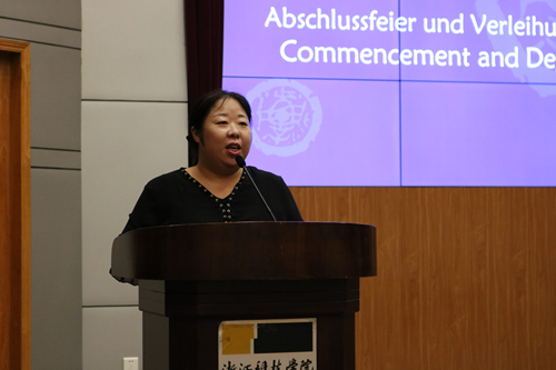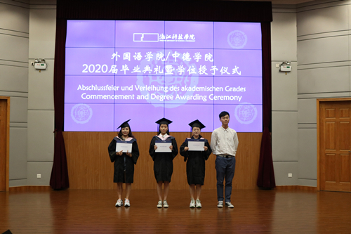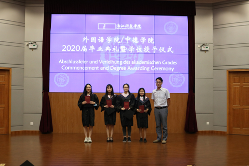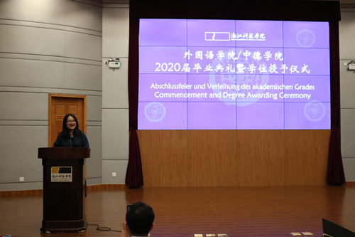 栀子花开季,毕业离别时。6月29日下午,外语学院/中德学院2020届毕业典礼暨学位授予仪式在图书馆西报告厅举行。院长朱吉梅,党委书记汤力峰,副院长王旭莲、韩晓亚,党委委员、英语系系主任方小卿,德语系系主任德语161班班主任林方,英语系王金生教授,英语161班班主任范琳,英语162班班主任冯巧娥,辅导员高卓出席。活动由党委副书记戈洪伟主持。