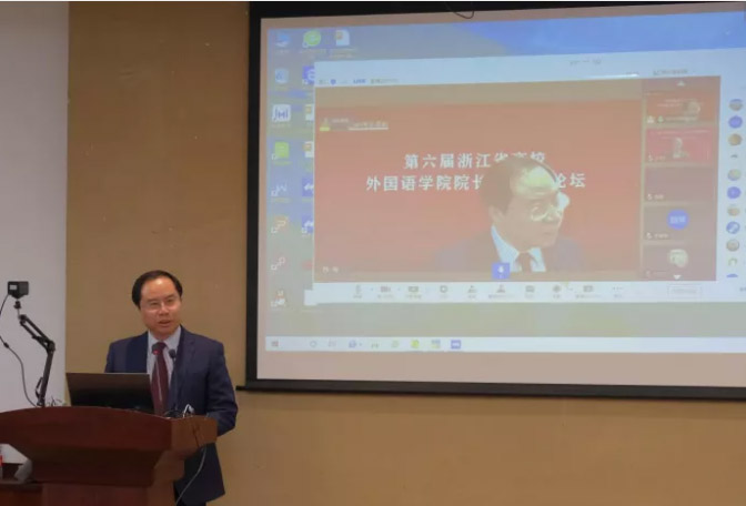 11月21日,“第六届浙江省高校外国语学院院长/系主任论坛”在杭州市小和山高教园区浙江科技学院闻理园隆重举行。浙江大学中华译学馆馆长许钧教授,华南农业大学外国语学院院长黄国文教授,上海外国语大学副校长查明建教授,上海师范大学外国文学研究中心主任朱振武教授,浙江外国语学院校长洪岗教授与副校长柴改英教授,以及来自省内外三十多所高等院校的外语学院院长、系主任与专业负责人齐聚西溪湿地源流之一的西蜜湖畔,小和山麓,共商新文科、新工科、大外语背景下高校外语学科发展战略。论坛由浙江省外文学会发起,浙江科技学院外国语学院/中德学院承办,上海外语教育出版社、杭州新琦迹英语协办。本届论坛采取了线上和线下结合的形式。
