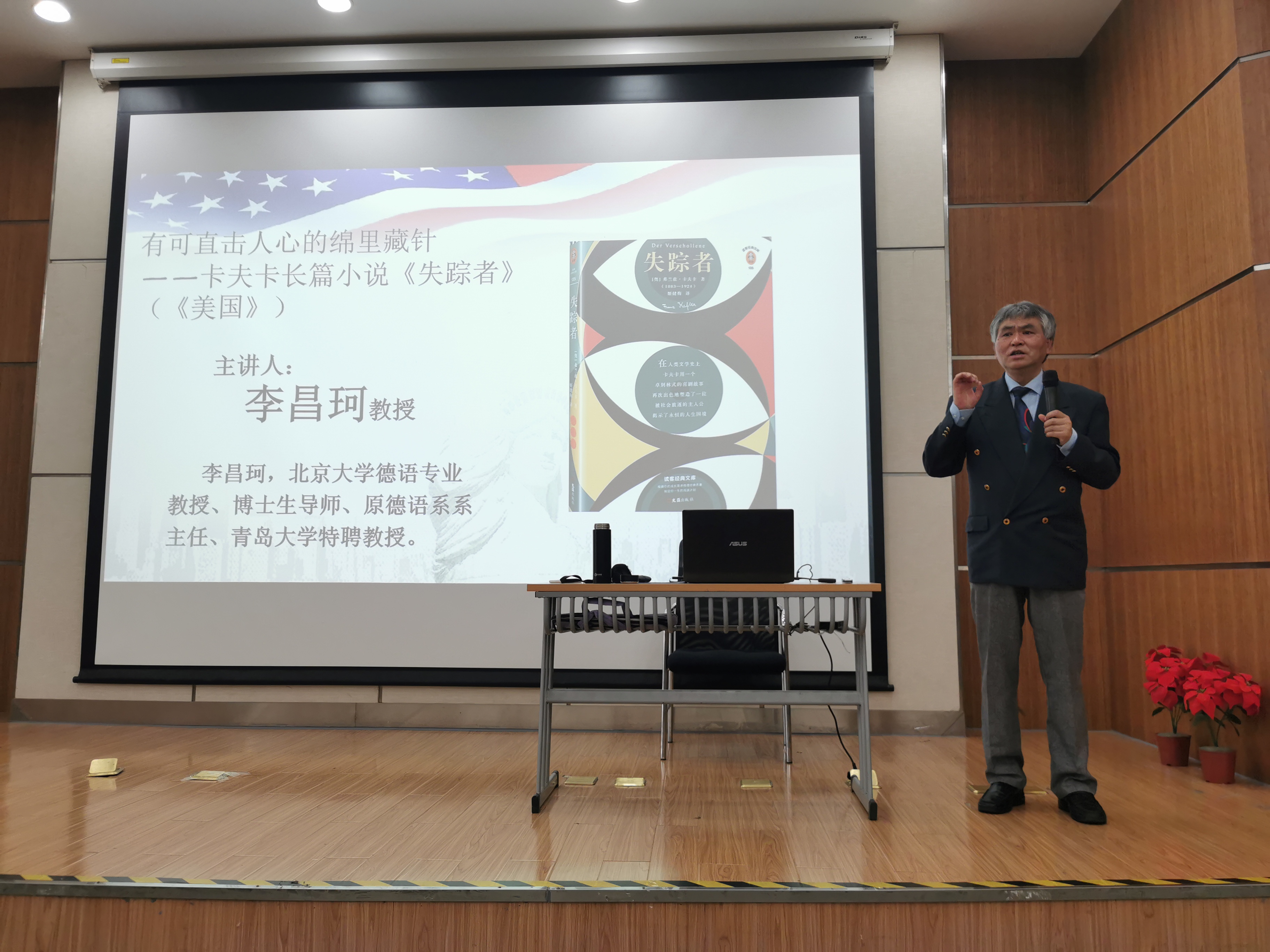 2021年4月23日外国语学院/中德学院 、中德应用型大学研究院/德语国家研究中心邀请北京大学德语专业教授、博士生导师、青岛大学特聘教授李昌珂教授作客明德讲坛及西蜜沙龙,在安吉校区中德楼B4报告厅作题为“有可直击人心的绵里藏针——卡夫卡长篇小说《失踪者》(《美国》)”的学术报告,ZUST文学与文化研究所长胡一帆副教授主持此次学术报告,外国语学院/中德学院教师、英语和德语专业大一、大二学生现场聆听了学术报告。