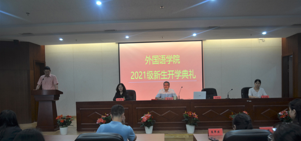 2021年9月5日上午,外国语学院2021级新生开学典礼在安吉校区图书馆四楼报告厅举行。学院党政班子、英语系主任、新生班主任、校友代表、在校生代表等出席典礼,在新征程的起点,展望未来,为外国语学院学子们送去热忱的欢迎和宝贵的经验。会议由党总支书记丁炳泉主持。