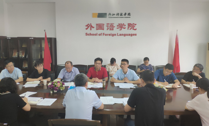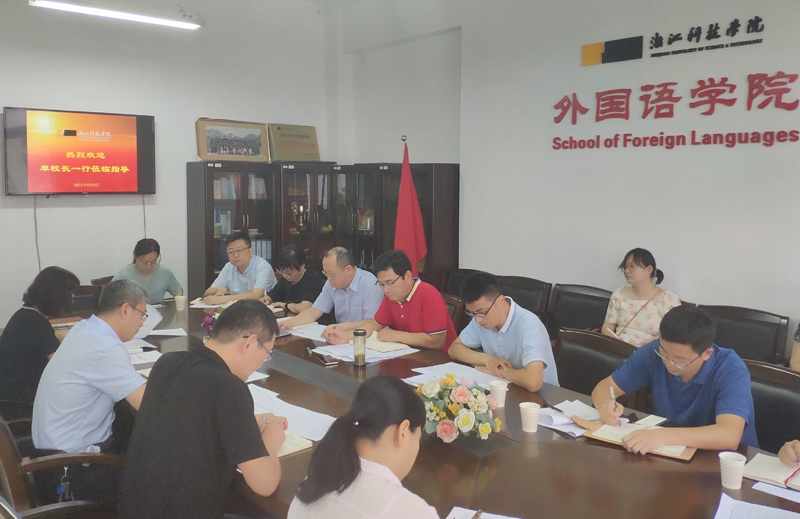 院长樊燕龙汇报了以“二培育、二中心、五方向”为重点的学院“十四五规划”及学生就业、师资队伍、实验室建设等外国语学院新班子成立以来所完成的一些工作情况。党总支书记丁炳泉在招生计划、社会服务等方面进行了补充。