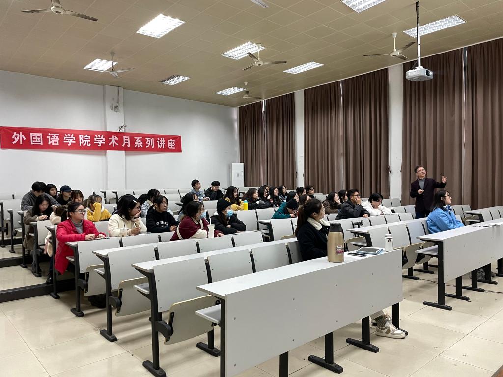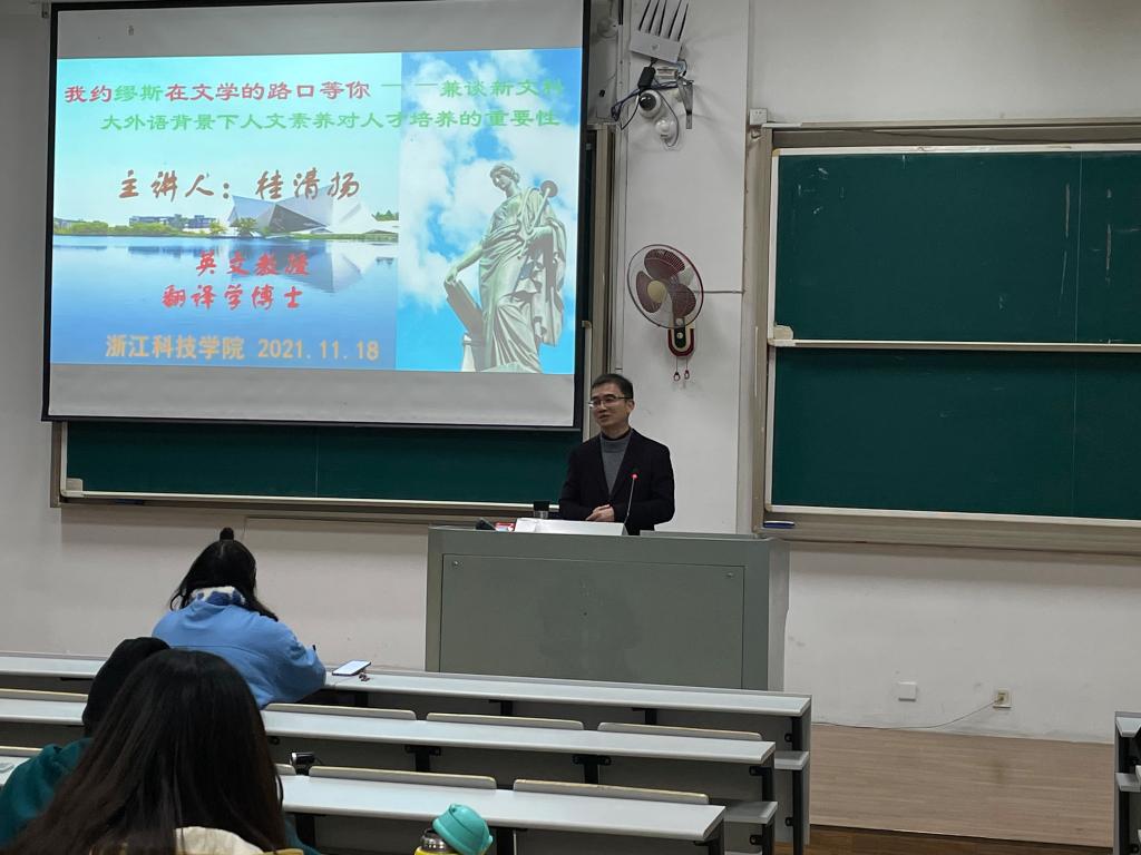 2021年11月18日,浙江外国语学院翻译学博士桂清扬教授应邀来我院,为我院学生做了题为“我约缪斯在文学的路口等你——兼谈新文科大外语背景下人文素养对人才培养的重要性”的讲座。讲座由外国语学院党支部副书记、副院长方小卿主持。