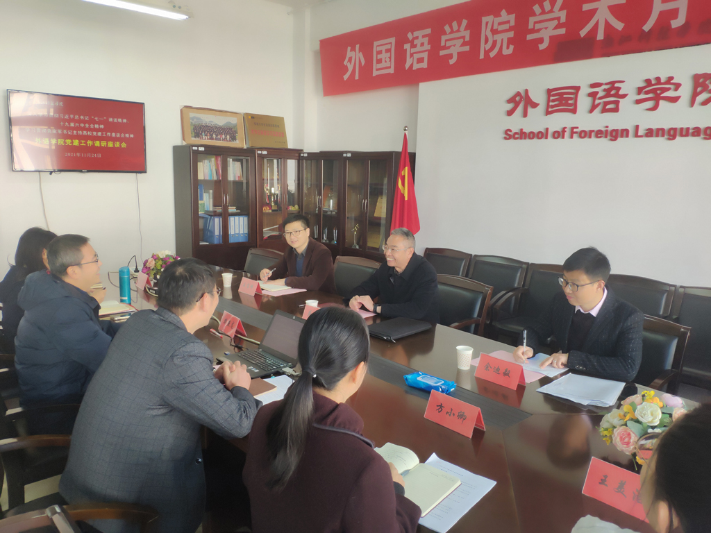 11月24日上午,学校党委书记龚建立教授来我院开展基层党建工作专题调研,校党委办公室副主任王宝明、校办综合秘书余迪毅等陪同调研。学院党总支书记丁炳泉、院长樊燕龙、副书记方小卿、师生党支部书记代表及组织员等参加调研会议。
