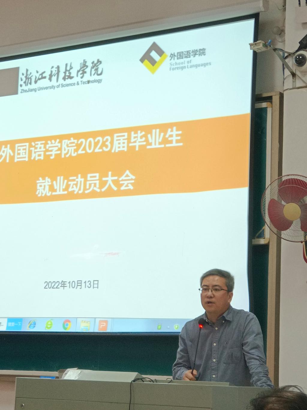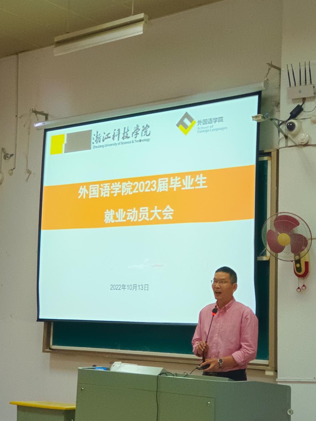 10月13日中午,外国语学院2023届毕业生就业动员大会在A3-125如期举行,院长樊燕龙、书记丁炳泉、副书记方小卿、毕业班班主任和招就处俞广良老师等出席,2019级全体毕业班同学参加,大会由毕业生辅导员王美洁主持。