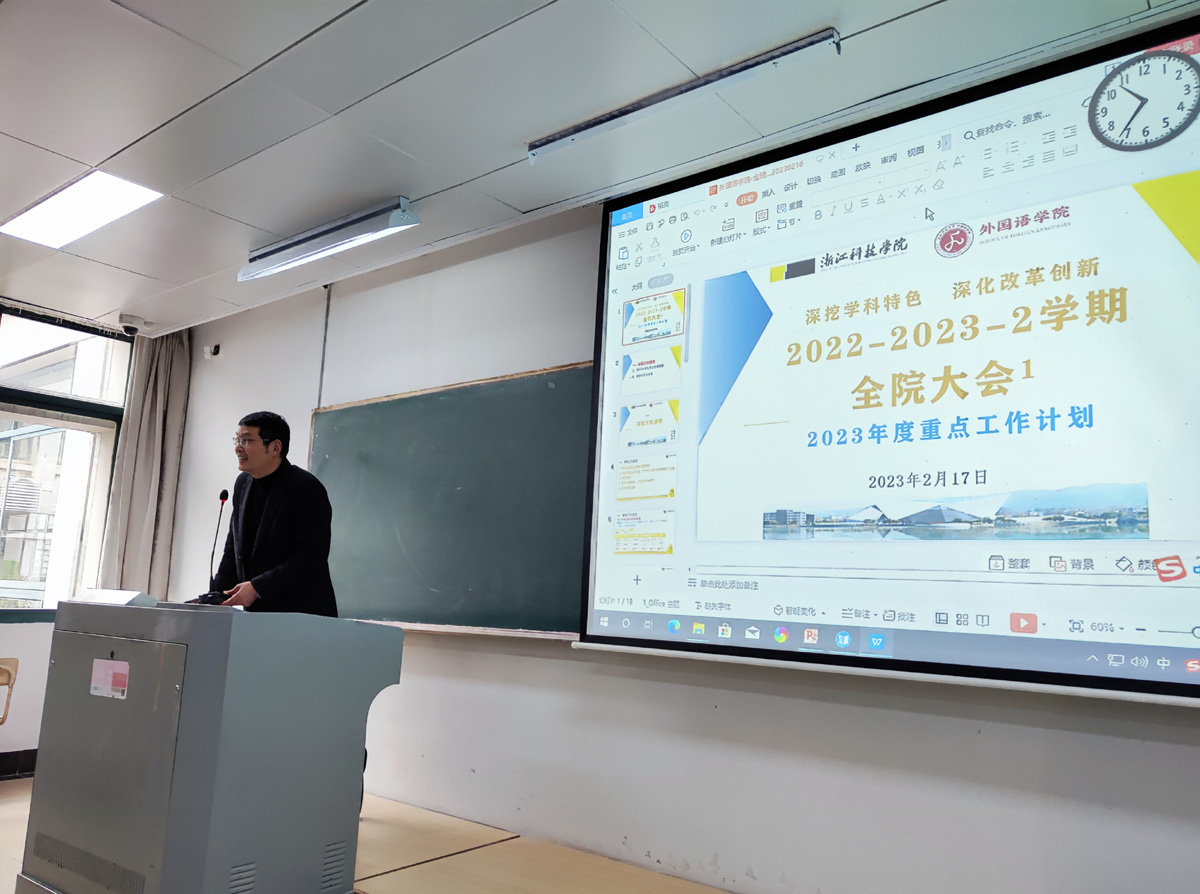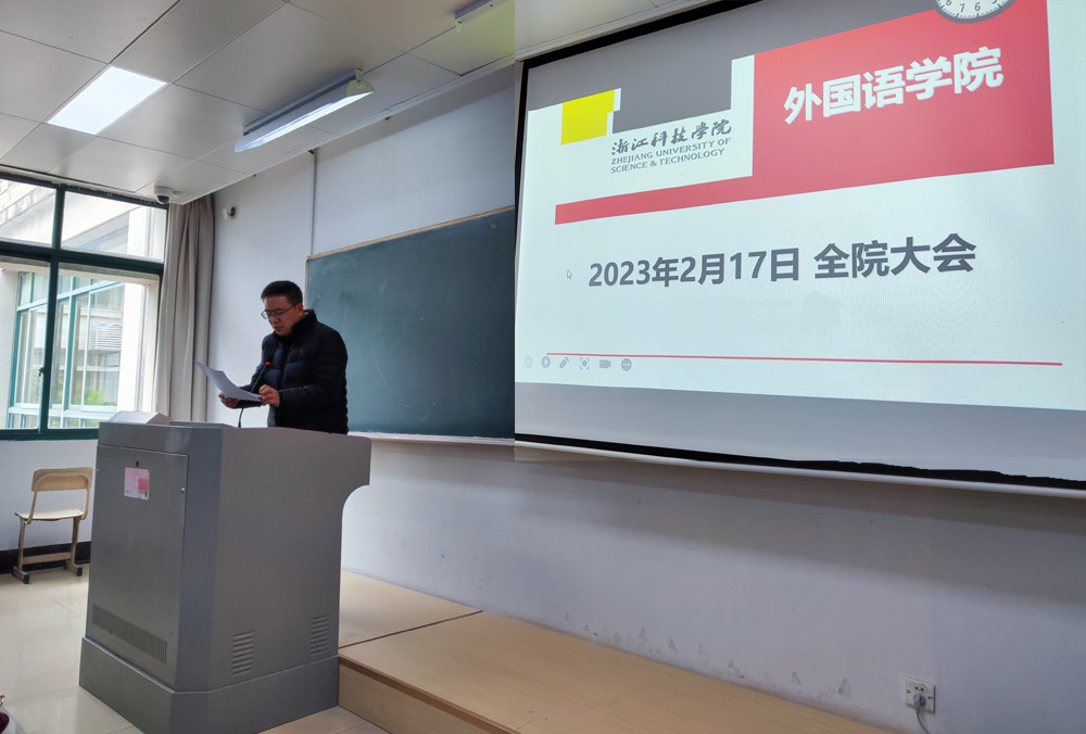以会促行,凝心聚力,共谋发展。217日上午,外国语学院在A2-215教室召开了新学期第一次全院大会,部署新学期各项工作,同时进行了今年第一次全院政治理论集中学习。会议由院长樊燕龙主持,外国语学院全体教职员工参加会议。