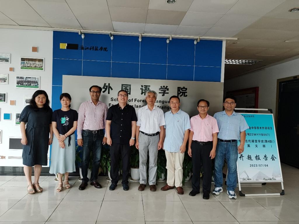2023年7月4日下午,外国语学院召开我院2023年国家社科基金中华学术外译项目《中国古代语言学史(第4版)》开题报告会浙江省外文学会常务副会长、浙江省翻译协会副会长、浙江大学博士生导师庞继贤教授,浙江科技学院硕士生导师税昌锡教授,浙江大学博士生导师、浙江省“西湖友谊奖”外籍专家英兰教授应邀担任评审专家,浙江科技学院科研处处长马伟锋出席并致辞,外国语学院相关项目组人员参加了此次会议。会议由外国语学院院长樊燕龙主持。