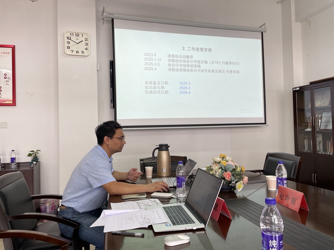 项目负责人赵学德博士从开题任务、课题方案及通讯评审意见等方面进行了开题汇报。汇报结束后,评审专家组依次进行点评发言。他们对团队前期的辛勤努力表示肯定,与会专家共同站在国家社科基金项目推进发展的高度,就组织方案、样章、翻译质量保证、章节删减与改写等给予多方指导,建言献策,使项目组受益匪浅。