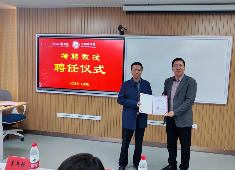 11月9日下午,外国语学院在闻理园A2-406隆重举行特聘教授聘任仪式,聘请浙江财经大学外国语学院黎昌抱教授为我院特聘教授。校党委委员、副校长李其朋,人事处处长徐华军和学院班子成员及全体教师出席聘任仪式。仪式由学院党总支书记丁炳泉主持。