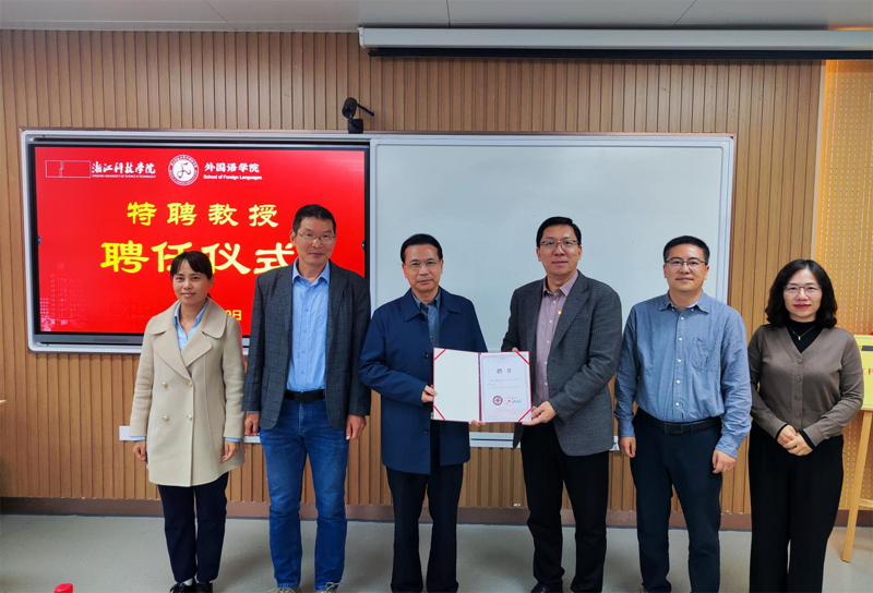 最后,黎昌抱教授做了表态发言。他表示,受聘特聘教授职位既是荣誉也是责任。在聘期内,他将会竭尽全力,促进外国语学院的学科和专业建设,带动学院教学科研团队发展,在提高教师学术水平、促进国内外学术交流等方面做出贡献。他将认真履行特聘教授岗位职责,不遗余力地支持学院发展,不辜负学院的期望。