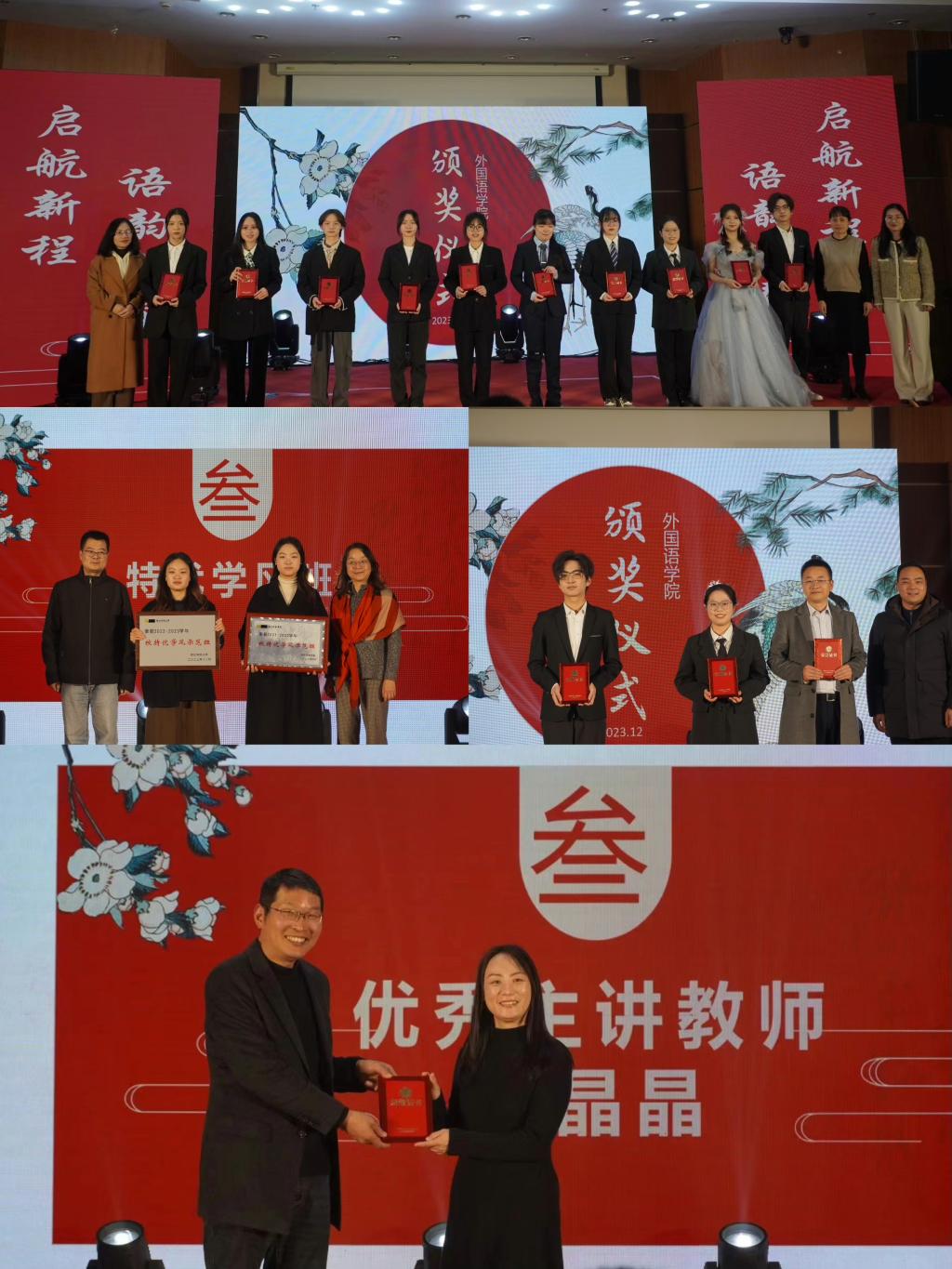 晚会上,还对我院校特优学风示范班和优秀师生进行了颁奖。王春叶老师、方小卿老师、王旭莲老师为我院风华学子们颁奖;姚腾老师为校年度人物吴华栋、校十佳团支书庄岚翔、优秀班主任代表冀艳民老师颁奖;朱吉梅老师和杨志祥老师为校特优学风示范班——英语201班和英语213班颁奖;党总支书记丁炳泉老师为校优秀主讲老师黄晶晶老师颁奖。
