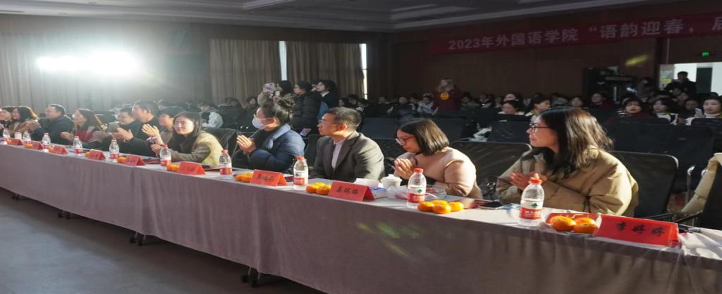 12月29日下午,外国语学院于安吉校区中德B4报告厅举行了“语韵迎春、启航新程”的双语迎新晚会。图书馆馆长朱吉梅老师、学工部部长、学生处处长杨志祥老师、安吉校区学生事务中心主任姚腾老师、校团委副书记王春叶老师、外国语学院党总支书记丁炳泉老师、副院长王旭莲老师、党总支副书记兼副院长方小卿老师、外教老师、班主任、辅导员以及全体学院学生共聚一堂,现场氛围热烈。
