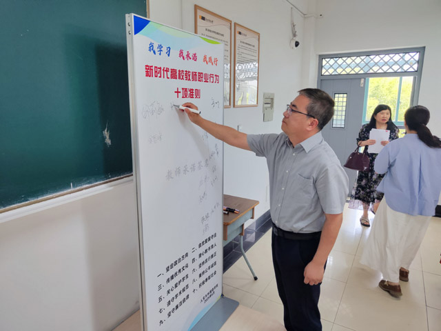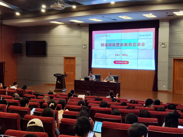 单书记首先从何谓“师德师风”入手,选取了近年来我国高校违反政治纪律、违反教育教学、违反生活纪律、侵害学生权益、违反学术诚信等多个方面的典型案例,给在场教职工进行了深刻的警示教育;接着,他带领大家重温学习了“新时代高校教师职业行为十项准则”,并重点阐述了我校关于师德师风建设规定的相关内容。单书记强调,师德师风是教育事业的根基,直接影响人才培养质量、教育发展进程与国家未来竞争力。作为教师职业道德的核心体现,师德师风建设既是落实立德树人根本任务的必然要求,也是深化教师队伍改革、回应社会关切的战略举措。他语重心长地告诫大家,要珍惜当下,弘扬践行教育家精神,努力铸就高尚师德师风。