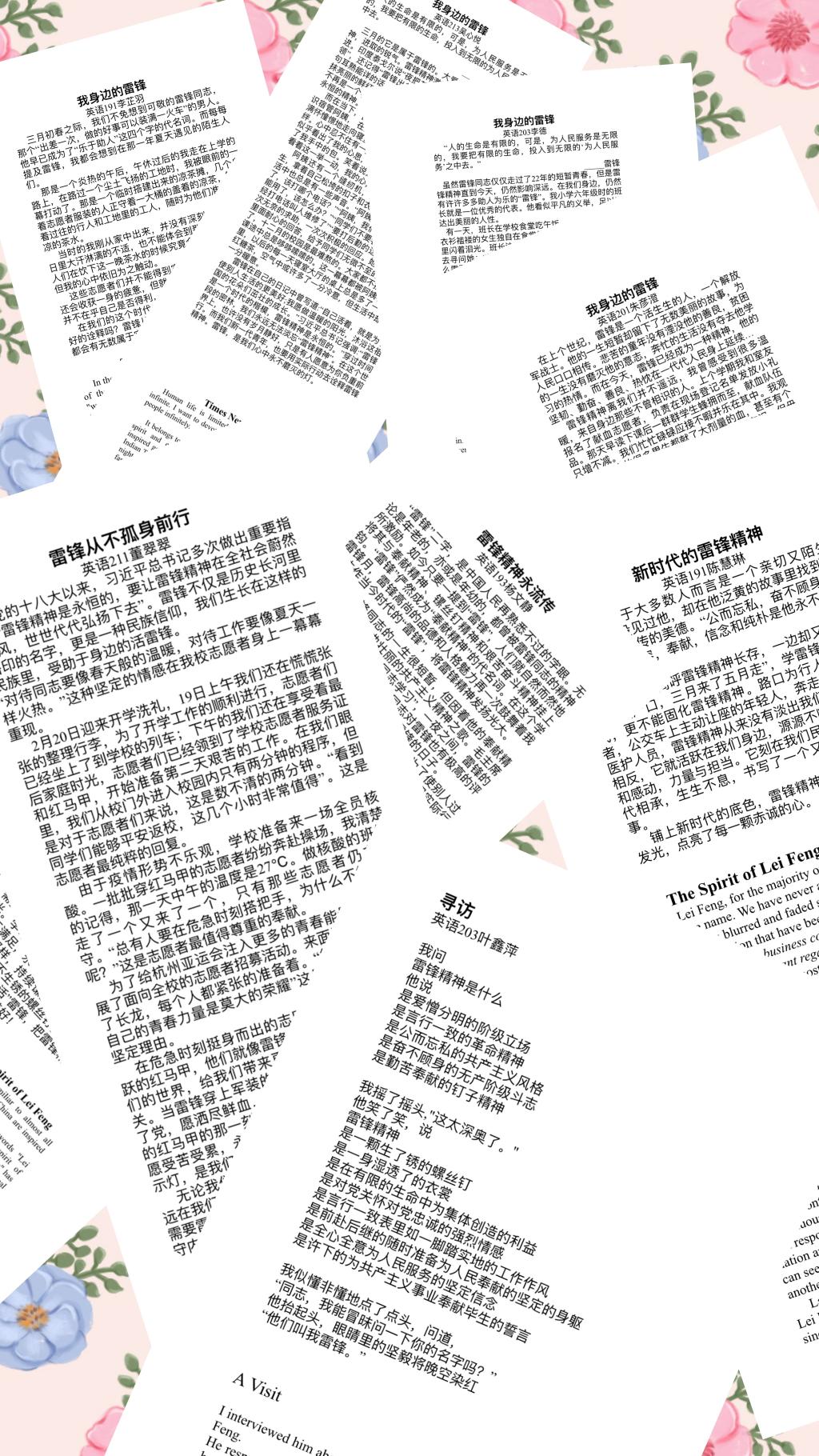 雷锋精神双语征文收录的作品衔华佩实,有的以校志愿者的服务活动为引探讨雷锋精神内涵,有的以自身受助经历为题抒发对雷锋精神的感谢,更有的以原创诗歌形式赞颂雷锋精神的崇高。