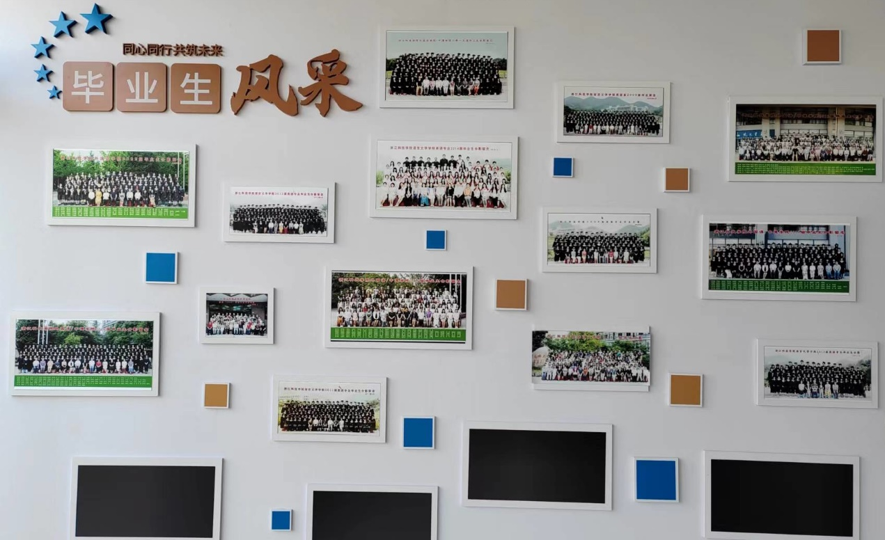 6月,学院在三楼外国语学院形象墙左侧开辟了院庆主题墙,设置毕业生风采专栏,以同心同行,共筑未来为主题,精心收集了各届学生的集体毕业照上墙。院庆主题墙的设计寄托了学院对所有学子的深切祝福与思念,旨在与外国语学院二十年来的毕业生一起留住美好时光,拥抱璀璨未来。当年一个个身着毕业盛装的青春学子,已是当前各行各业的栋梁之材,在回到学院之际,可以充分体会回家的温暖感觉,寻找自己和师长的身影,在主题墙前打卡留念。