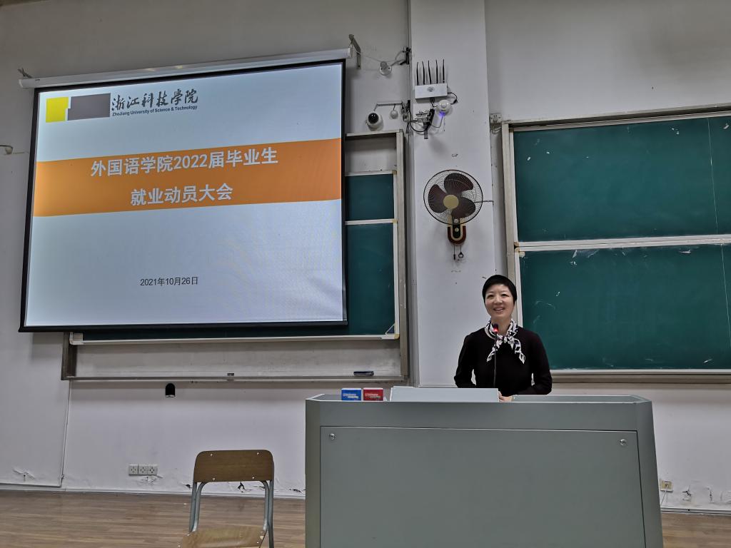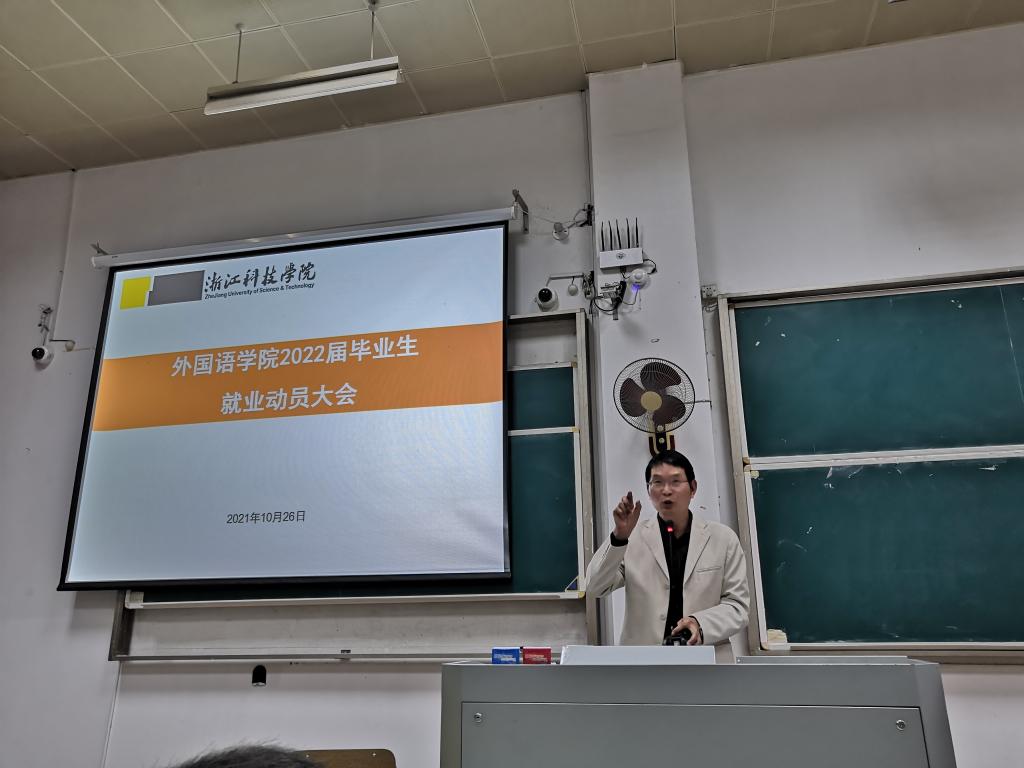 10月26日下午,外国语学院2022届毕业生就业动员大会在A3-119教室如期举行,院长樊燕龙、党总支书记丁炳泉、副书记方小卿,我校招就处及大学生就业指导中心俞广良老师、各毕业班班主任、辅导员和全体2022届毕业生参加会议。大会由外国语学院2022届毕业生辅导员王美洁主持。