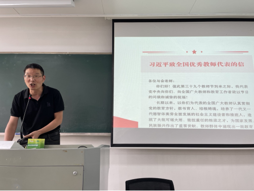 最后,党总支书记丁炳泉带领大家一起学习了习近平总书记致全国优秀教师代表的信,国家的兴衰取决于教育,教育的兴衰取决于教师,教师是立校之本,师德是教育之魂。他希望学院全体教师以此次师德师风建设大会为契机,以身边的先进典型为榜样,进一步加强理论学习、涵养道德情操、精进教研能力、真心关爱学生,在实践中不断提高师德师风水平,争做“四有”好老师和育人“大先生”,为学校的发展和学生的成长做出更大的贡献。