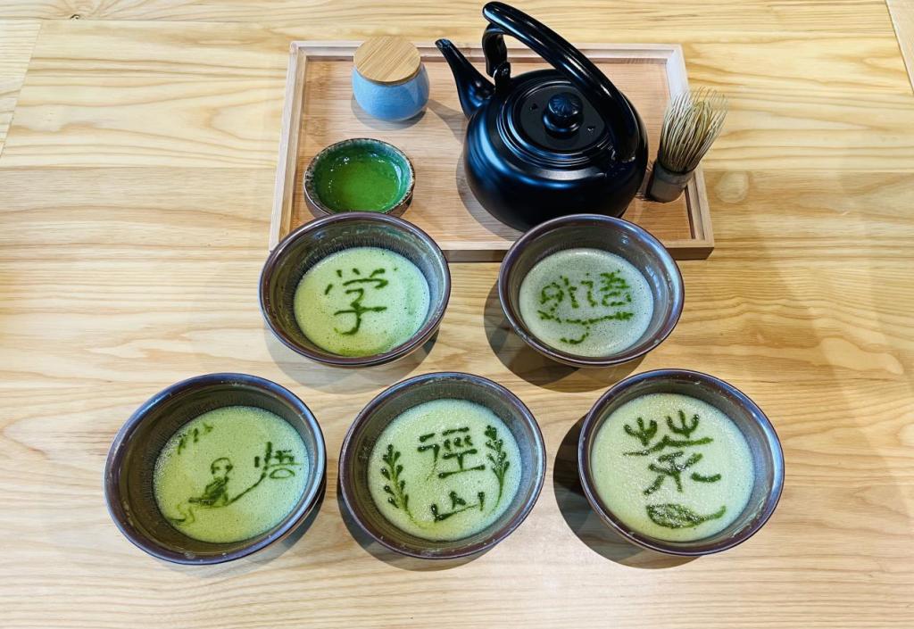 大家在茶艺师的指导下,一汤量茶受汤,调如融胶,二汤击拂即力,珠玑磊落,三汤击拂轻匀,粟文蟹眼,四汤稍宽勿速,轻云渐生...如此反复七汤,终成茶百戏。最终大家点茶完成的茶汤,组成了本次活动最美的一句“茶话”--学外语,悟径山茶。
