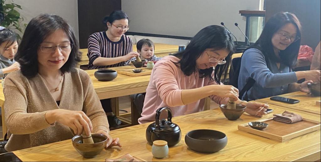 老师们先去体验了径山禅茶。中国的茶文化成于唐、盛于宋。宋朝的饮茶在继承了隋唐时期的煎、煮茶法之外,又兴起了点茶法,文人雅士生活面有了“斗茶和茶百戏”茶文化。径山是世界抹茶之源,伫立于径山之巅的径山寺更是禅茶的发源地。径山茶宴在2022年被列为非物质文化遗产。