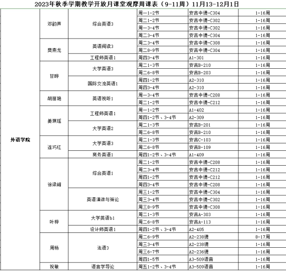 1、2023年秋季学期教学开放月课堂观摩周课表(9-11周)11月13-12月1日